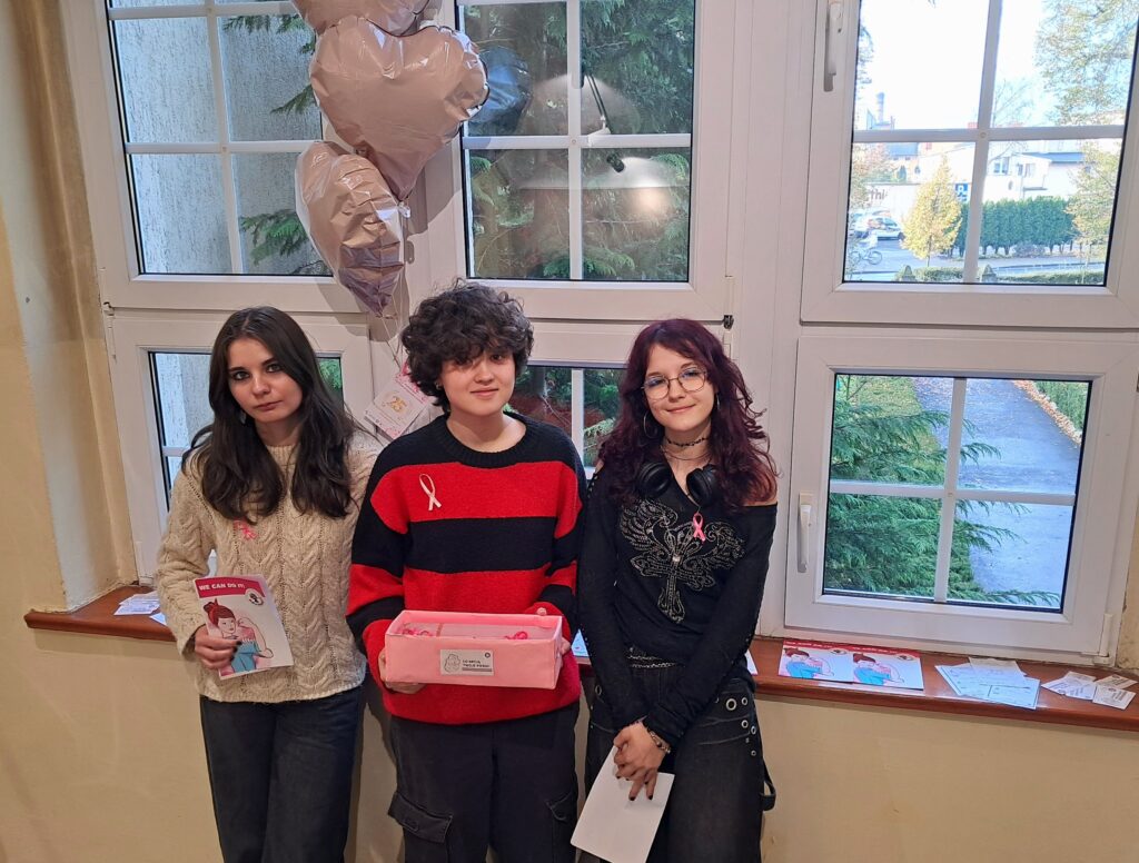 Nasza szkoła włączyła się także do akcji „Różowa Kokardka” – jest to symbol walki z rakiem piersi, znakiem solidarności z osobami dotkniętymi chorobą oraz przypomnieniem o tym, że profilaktyka ratuje życie.