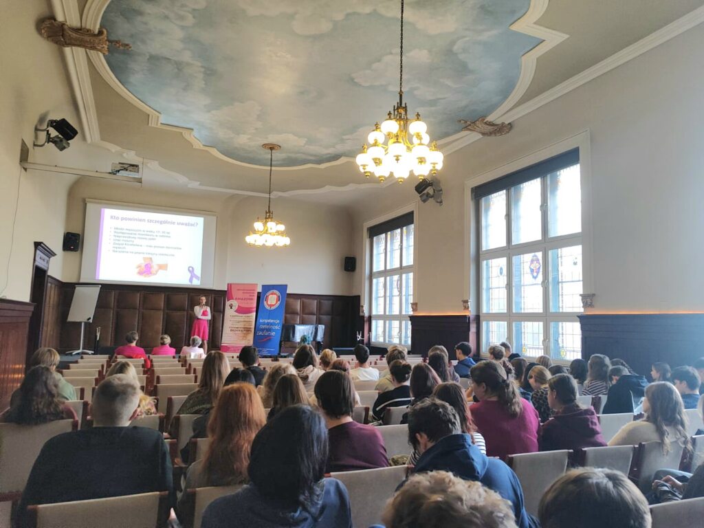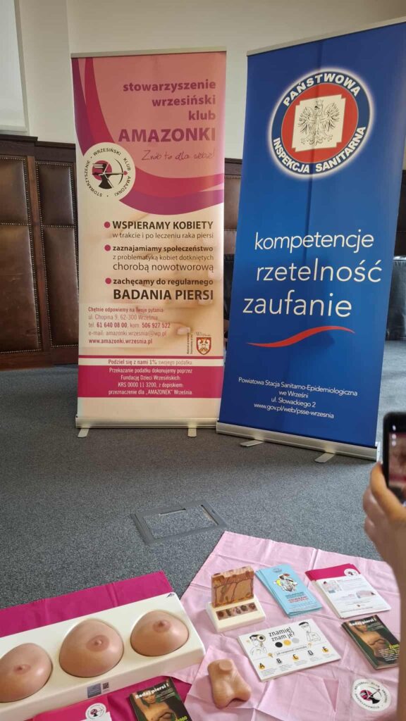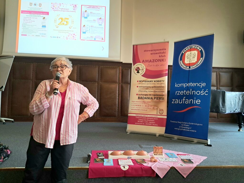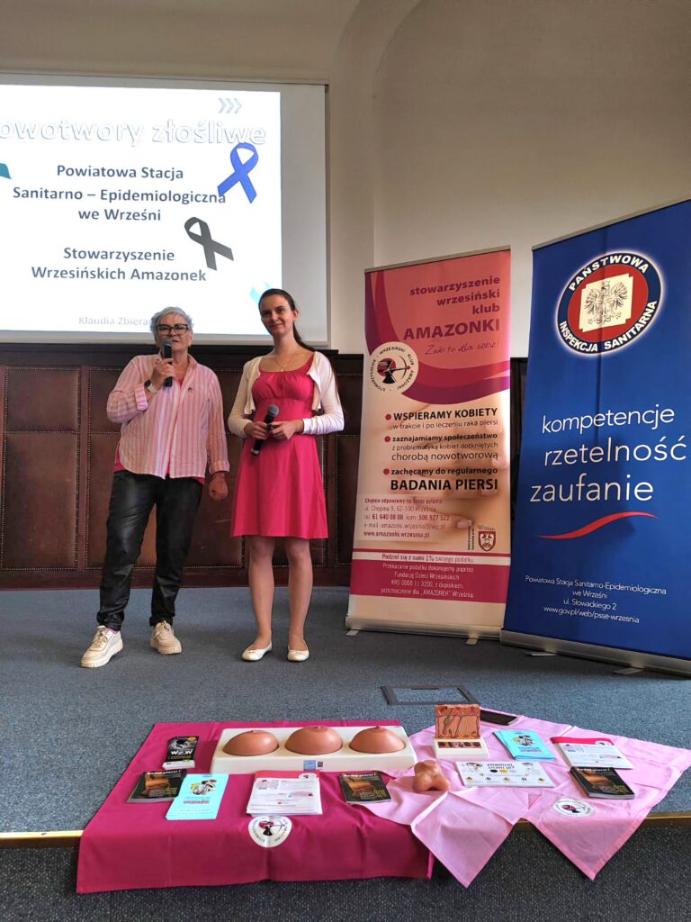 Październik na całym świecie obchodzony jest jako Miesiąc Świadomości Raka Piersi. W związku z tym dnia 23 października 2025r. uczniowie naszej szkoły uczestniczyli w spotkaniu z przedstawicielkami Wrzesińskiego Stowarzyszenia „Amazonki”. Panie szczególnie mocno podkreślały znaczenie profilaktyki, wczesnej diagnostyki oraz edukacji zdrowotnej w zakresie tego najczęściej występującego nowotworu złośliwego u kobiet. Tylko wczesne wykrycie oraz włączenie skutecznego leczenia jest w stanie powstrzymać tę jedną z kluczowych chorób cywilizacyjnych. Panie zademonstrowały także na fantomie piersi techniki samobadania oraz zachęcały do obserwacji własnego ciała.