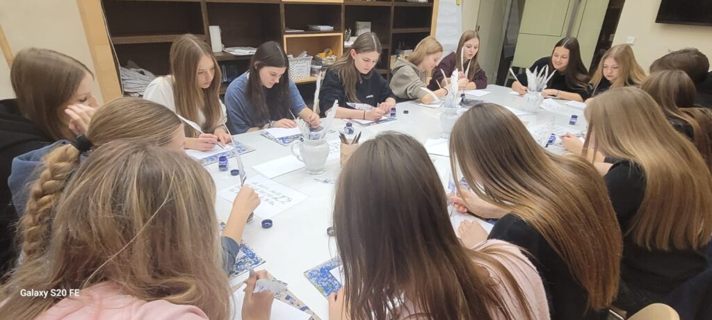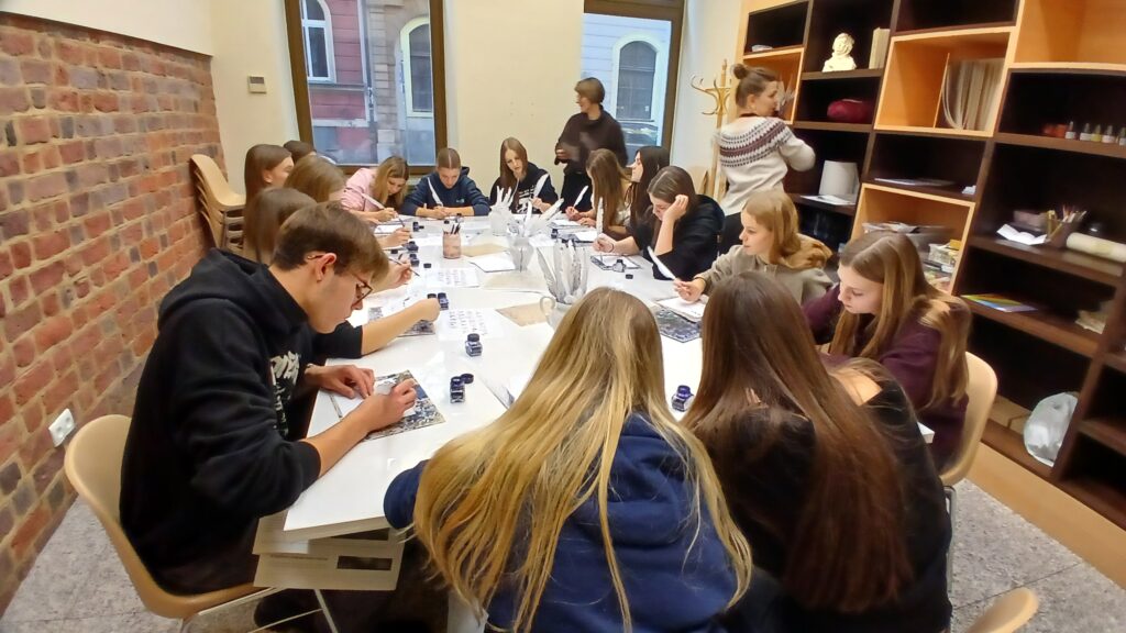 Naszą wycieczkę rozpoczęliśmy od zwiedzania Muzeum Pana Tadeusza, gdzie uczniowie mieli okazję przenieść się w czasy Adama Mickiewicza. Największą atrakcją okazało się pisanie gęsim piórem – było to niezwykłe doświadczenie i świetna lekcja historii oraz kultury.